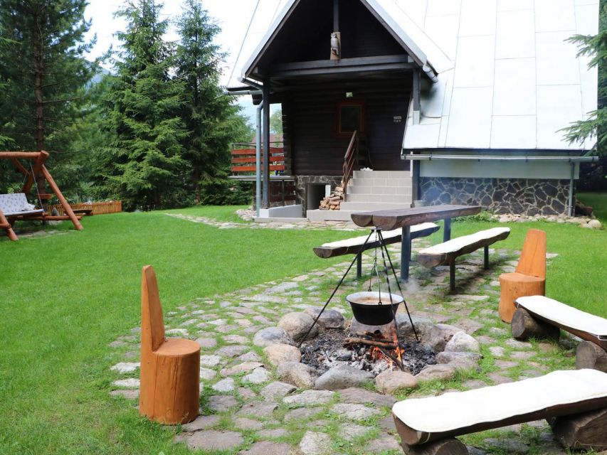 Pred chatou je ohnisko s posedením, ideálne na prípravu gulášu, večerné grilovanie alebo opekanie.